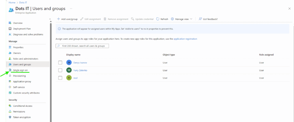 10. You are back on the application page under Users and Groups and you can see all the users you have assigned. Click Single sign-on tab, from the application sidebar index.