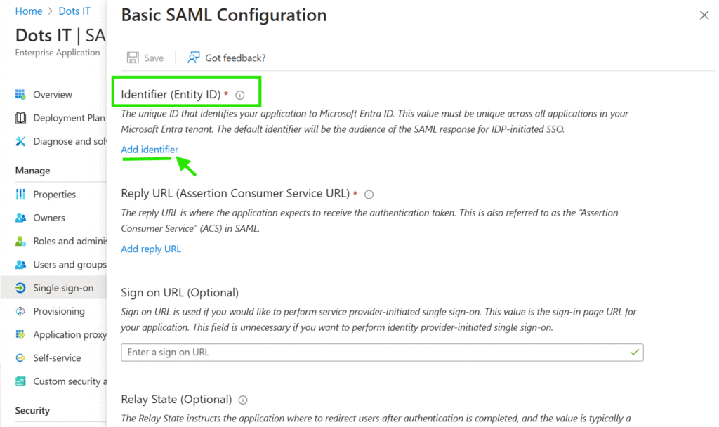 13. A slide page will appear, click Add identifier under the Identifier (Entity ID) option.