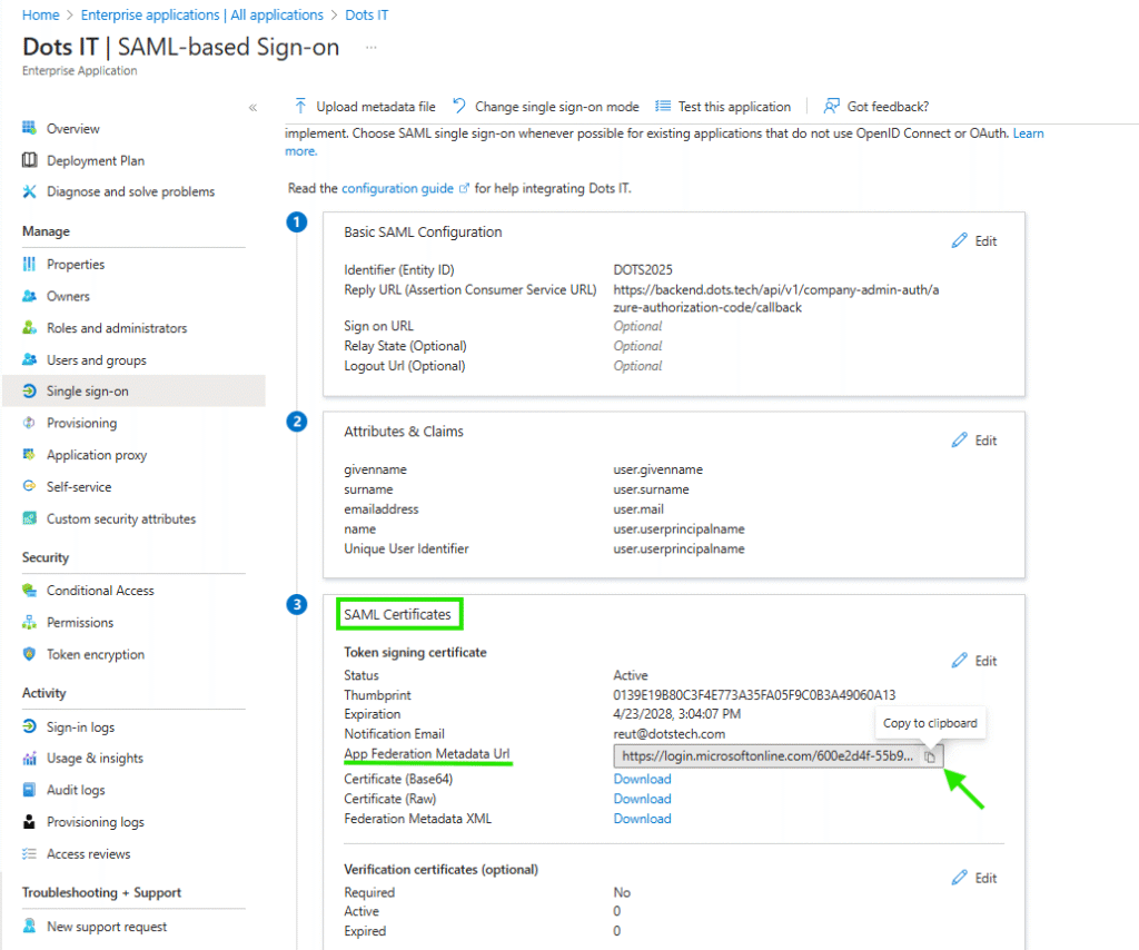 18. In the SAML Certificates section (section number 3) , copy App Federation Metadata URL.