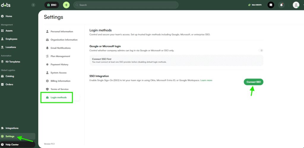 20. Go to your Dots dashboard Settings TAB and choose Login Methods from the index. Click on Connect SSO.