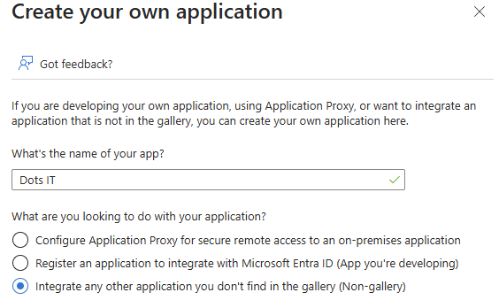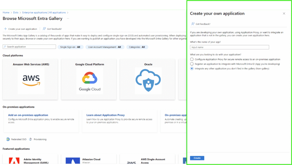 4. The Microsoft Entra Gallery page will open. Click on Create your own application, and a side page will open on the right side of the screen.