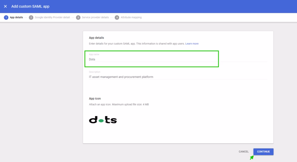 As part of the setup, you will create a Dots application, which will allow you to access Dots through your Google App portal.