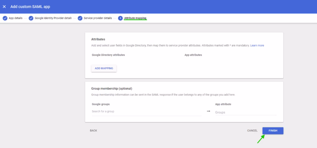 Step 4: Attribute Mapping. You can leave the default values as-is. Just click Finish.