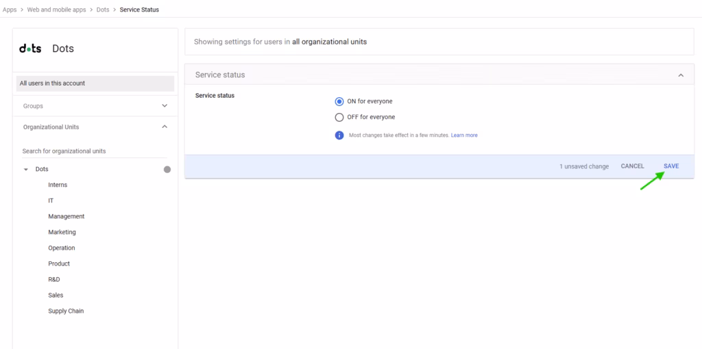 7. Enable the App for Users. Under User access you can configure access by group, or simply choose “ON for everyone”. When you choose “On for everyone”, only users who are part of your organization and have a user in Dots will be able to log in to your Dots dashboard.